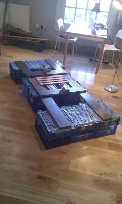 This little baby is a one person, foldable raft. Suitable for canals and rivers. She’s made of bottles, plastic crates, skate wheels and a few old floorboards. It all folds up to a nice neat cube thats a reasonable trailer size and not too heavy. It clips onto the back of a bike pannier for bike trips and is modular so two rafters can join up together, nice!
